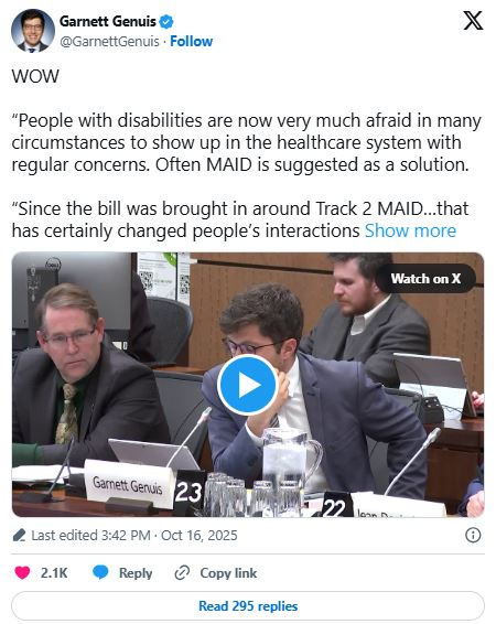 LifeSteNews reports: During an October 8 session of the Parliamentary Finance Committee, Carr, an advocate against Medical Assistance in Dying (MAiD), explained that Canada’s expansion of MAiD to the non-terminally ill has led to people with disabilities being pressured to end their lives during unrelated medical visits.