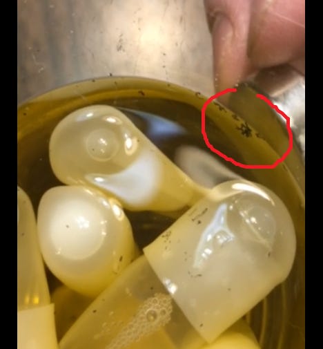 Some additional information came to my attention during the writing of this article. The black ink printed on the side of pharmaceutical capsules actually consists of mysterious black specks which are magnetic. A contact sent me a video, represented in the following screen shot, showing pharmaceutical capsules soaked in water for several hours, after which the black "ink" from the capsules turned into black specs that displayed startling magnetic properties. In this still photo, you can see the black specs gather at the common magnet held against the glass: