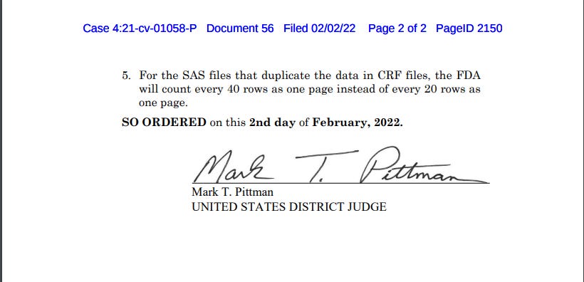 Good news. Final order on FDA's motion to modify rate for producing Pfizer docs: 10k pages/month first two months, 80k pages/month next three, 70k next month, then 55k a month. And FDA can only count as half pages the large number of duplicate data pages.