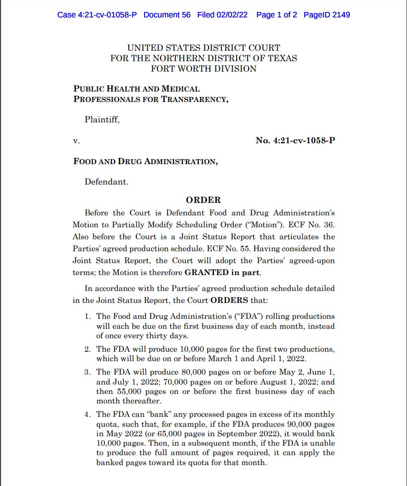 “ The FDA will produce 10,000 pages for the first two productions, which will be due on or before March 1 and April 1, 2022. 3. The FDA will produce 80,000 pages on or before May 2, June 1, and July 1, 2022; 70,000 pages on or before August 1, 2022; and then 55,000 pages on or before the first business day of each month thereafter.”