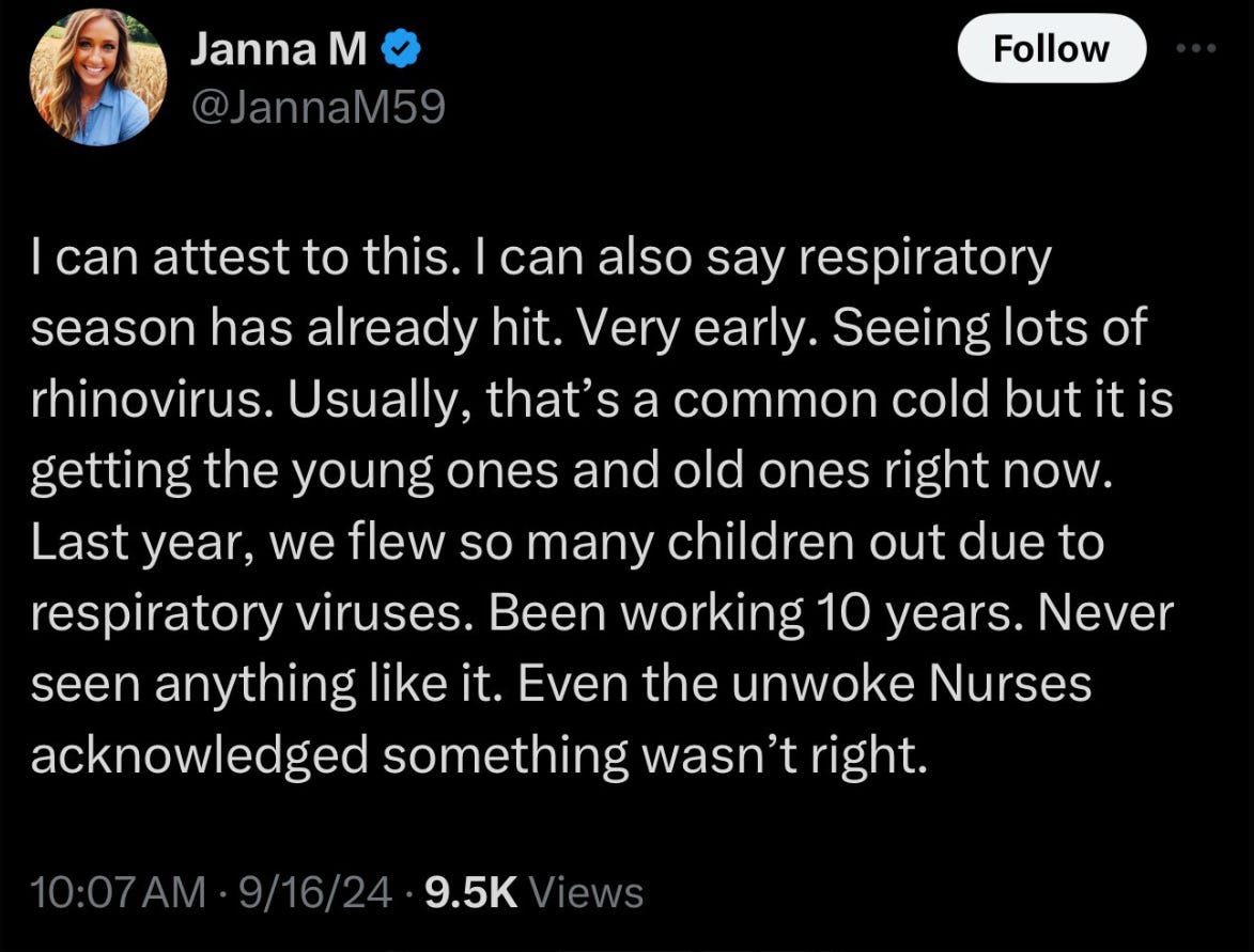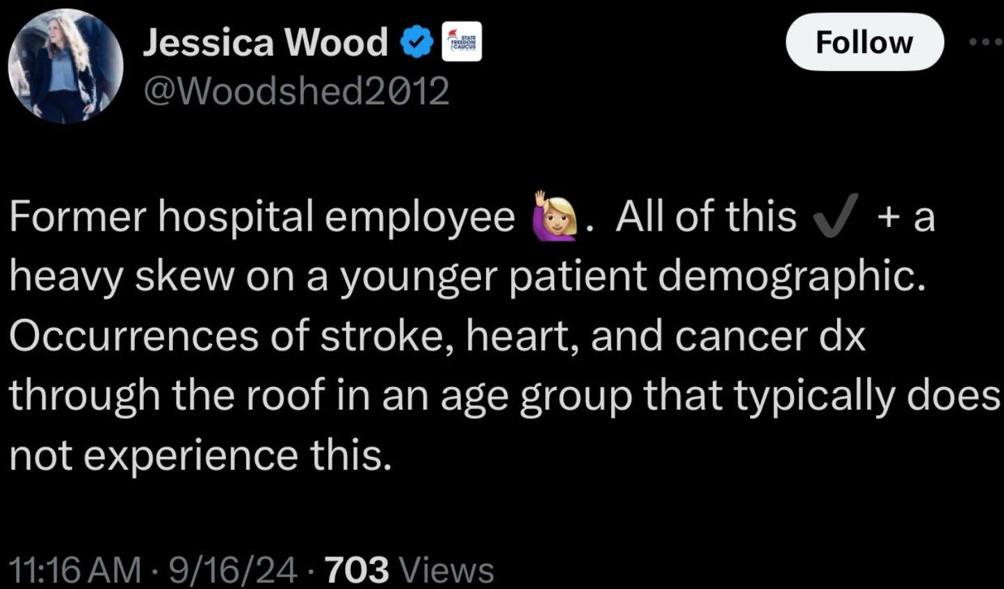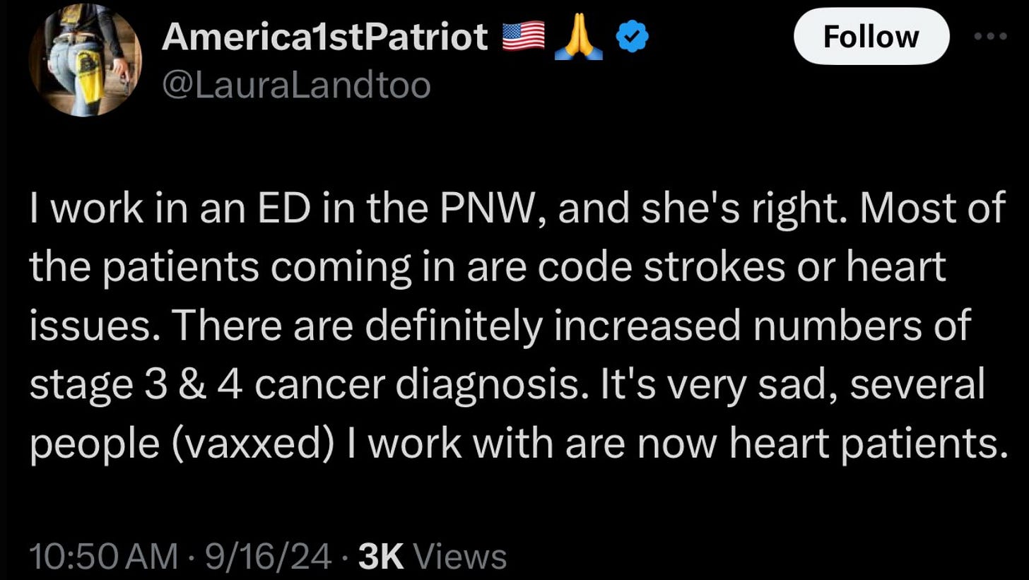 “..Heart issues, kidney issues, diabetes issues in patients that did not have diabetes went up 75% in 2022, people that had diabetes, their diabetes is no longer under control, they are on 2 or 3 different medications. That’s just a beginning. Heart issues, Turbo Cancers are out of control…It’s truly terrifying…and people are dying at a rate that blows my mind. I’ve been here for 16 years. I’ve never seen people die like this, ever…”