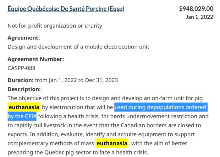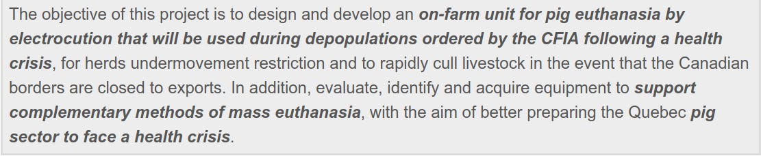 CIFA is, of course, the Canadian Food Inspection Agency. That’s very interesting. Supposedly, we need to design systems to mass euthanize pigs, in the event of some upcoming health crisis. Has it already been determined?