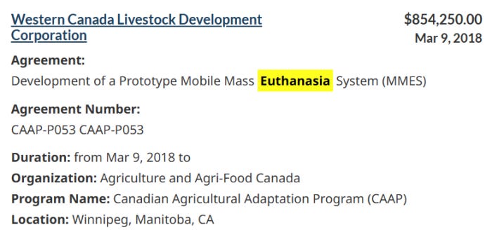 Canadian Grants In Recent Years To Develop Mass Euthanasia Systems For Animals