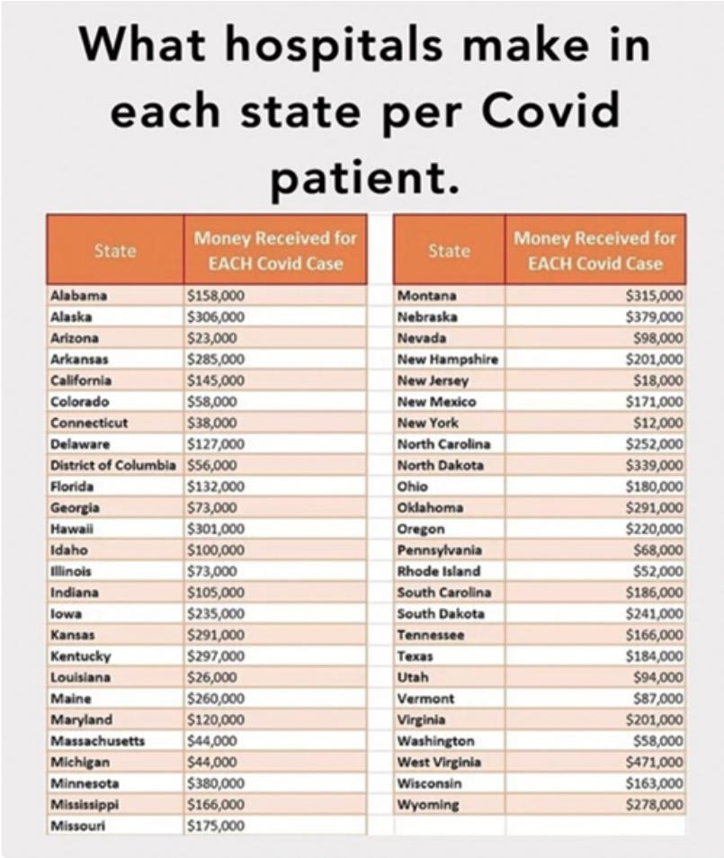 When hospitals followed those protocols they collected beaucoup tax payer dollars from the federal government, with the highest payments for patients who died. The following chart shows the monies each state received for each C-19 patient.