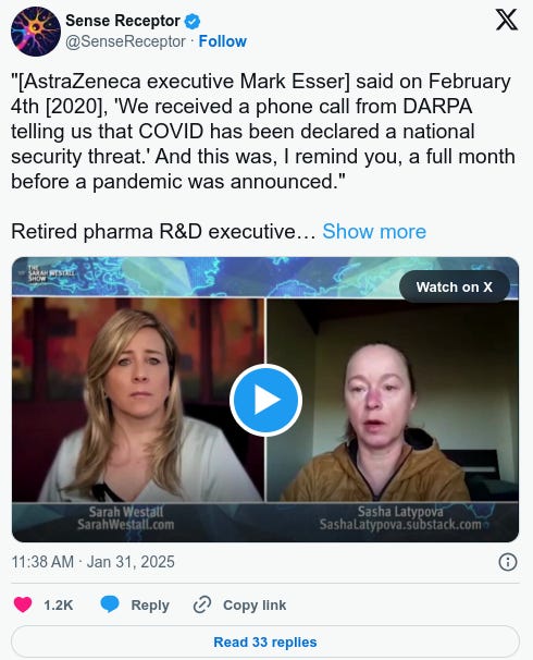 "[AstraZeneca executive Mark Esser] said on February 4th [2020], 'We received a phone call from DARPA telling us that COVID has been declared a national security threat.' And this was, I remind you, a full month before a pandemic was announced."