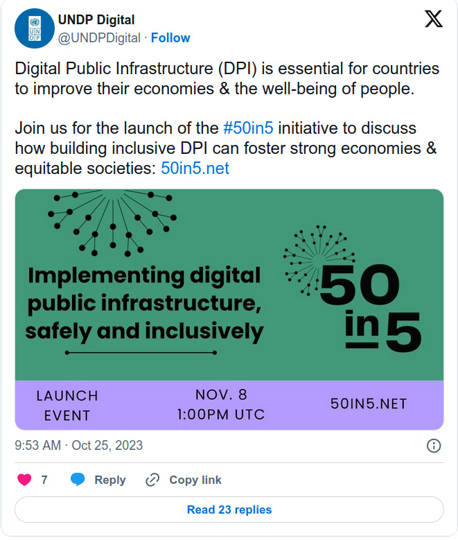 The United Nations, the Bill and Melinda Gates Foundation, and partners of the Rockefeller Foundation are launching a campaign to accelerate digital ID, digital payments, and data sharing rollouts in 50 countries under the umbrella of digital public infrastructure (DPI) by 2028. (source).