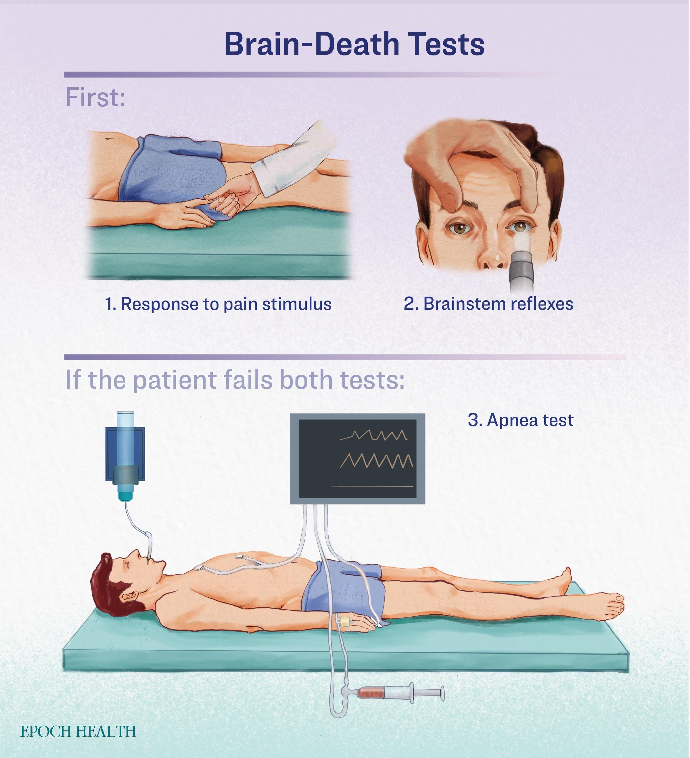 To assess brain death, doctors use a pain stimulus, check for brainstem reflexes, then conduct an apnea test if the patient fails both tests. (Illustration by The Epoch Times)