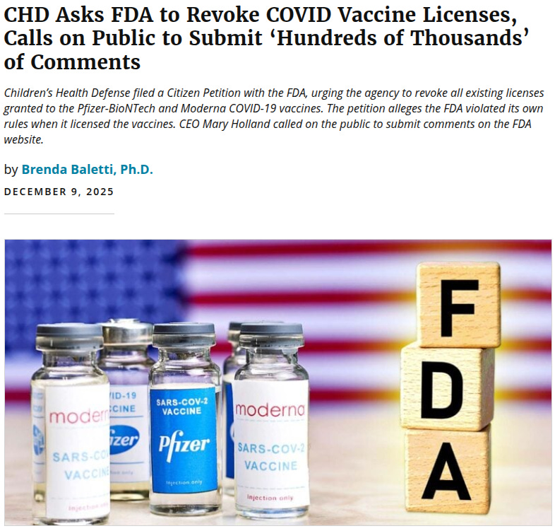 Children’s Health Defense (CHD) is asking the U.S. Food and Drug Administration (FDA) to revoke the licenses for all Pfizer-BioNTech and Moderna COVID-19 vaccines.