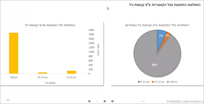 The researchers found that in the youngest age group – ages 5-11, adverse events are 2-4 times more common (depending on the specific adverse event described) compared to the older age group, aged 12-17. This finding is very surprising and especially troubling in light of the fact that the percentage of vaccinated among the young group is much lower compared to the larger age group. In fact, according to the MOH's COVID dashboard, only 25.1% of children aged 5-11 received one dose of the COVID vaccine, 17.7% received two doses, and 0.1% received three doses. In contrast, among 12-15-year-olds 65.6%, 54.6% received two doses, and 14.8% received three doses. Among 16-19-year-olds 89.3% received one dose, 78.2% received two doses, and 45.9% received three doses. That is, while the immunization rate among ages 5-11 is 3-4 times lower for the first and second doses of the vaccine, the rate of reported adverse events in this group is 2-4 times higher!