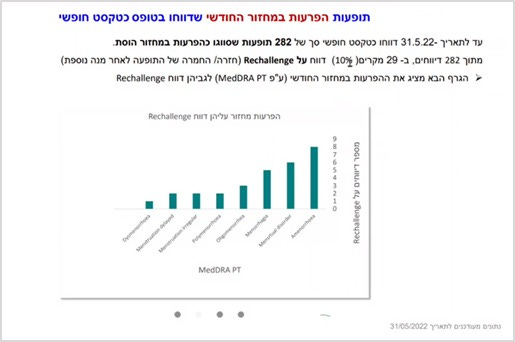 Another finding identified and characterized by the research team is a phenomenon called Rechallenge - recurrence /exacerbation of a previous adverse event after receiving another dose of the vaccine - thus, it was found that in 10% of cases where menstrual disorders were reported, there was a recurrence /exacerbation of the adverse events following another dose of the vaccine.