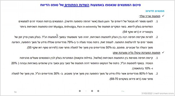 Similarly, other reported adverse events have also been identified as long-lasting. For example, with regard to musculoskeletal symptoms, the researchers wrote that while Pfizer's' leaflet stated that adverse events such as back pain only lasted for several days and then disappear, in the current analysis - in 79% of the reports which included information about these adverse events, it was noted that the duration lasted more than a week. Of these, about 50% indicated a duration of over six months!