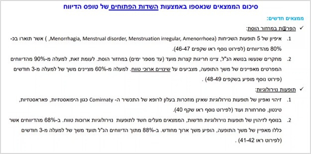 Thus, as can be learned from the slide presented above, as well as from the following slide, the research team found that while studies examining the topic of menstrual disorders have so far claimed that such disorders are short-lived (up to several days), in the present study most reports indicate long-term adverse events. For example, more than 90% of the reports, which relate to menstrual disorders and specify characteristics of the duration of the problem, indicate long-term changes.