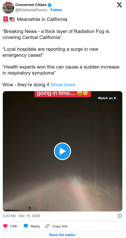 The SF Bay Area is also hit with this so called "Tule" geoengineered fog...we've had it for over 3 weeks' now and my eyes are so sore that I can barely see...