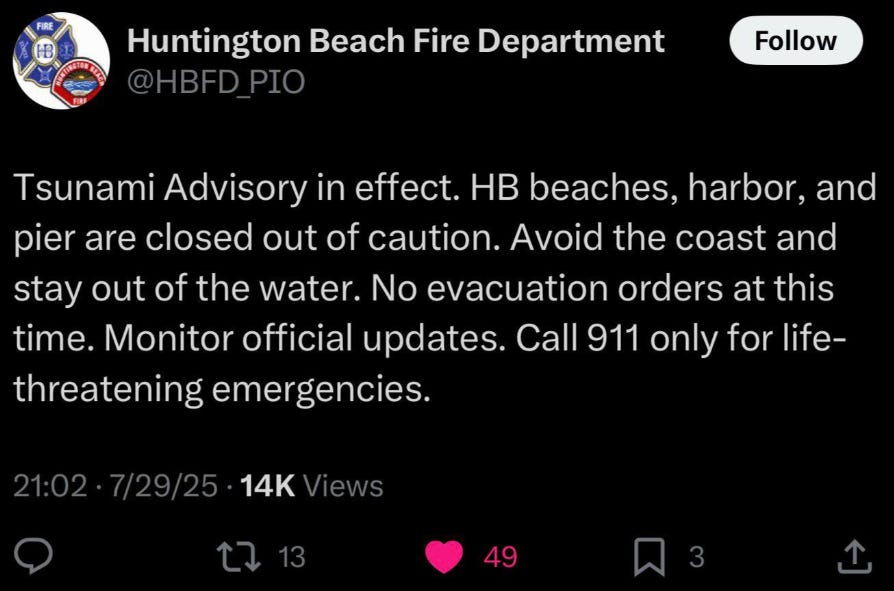 All beaches, harbors, and the pier in Huntington Beach, California have been closed due to the Tsunami Advisory.