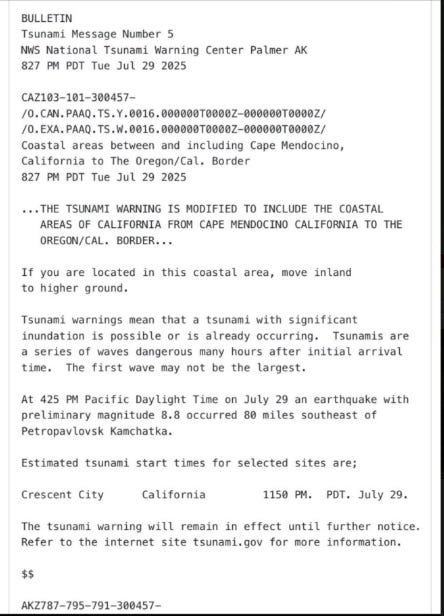 TSUNAMI WARNING ISSUED FOR NORTHERN CALIFORNIA From Cape Mendocino to the Oregon border. GET AWAY FROM THE COASTLINE!