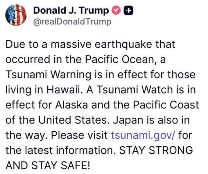 President Donald Trump took to social media to warn of the tsunami, saying that a watch was in effect for the Pacific Coast of the United States.