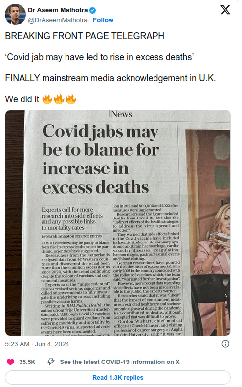 The UK Telegraph published a report on its front page titled, “Covid vaccines may have helped fuel rise in excess deaths.”