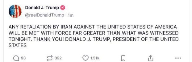 Trump concluded: "Congratulations to our great American Warriors. There is not another military in the World that could have done this. Now is the time for peace! Thank you for your attention to this matter".