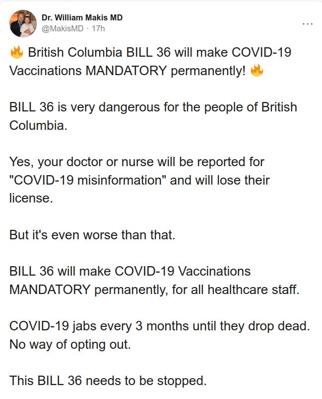 British Columbia BILL 36 will make COVID-19 Vaccinations MANDATORY permanently! Your doctor or nurse will be reported for "COVID-19 misinformation" and will lose their license. COVID-19 jabs every 3 months until they drop dead. No way of opting out. - Dr. William Makis MD