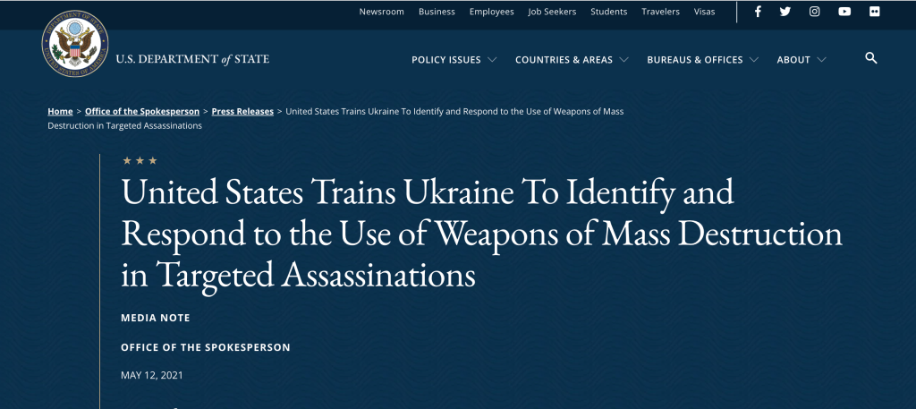 Back in May 2021, the State Department announced that Washington had conducted a “virtual training exercise” with “partners” in Kiev, including domestic security services, law enforcement, and first responders, to “identify, respond to, and investigate assassinations involving weapons of mass destruction,” due to “recent events in Europe” highlighting “the real threat of government-sanctioned, targeted weapons of mass destruction attacks.”
