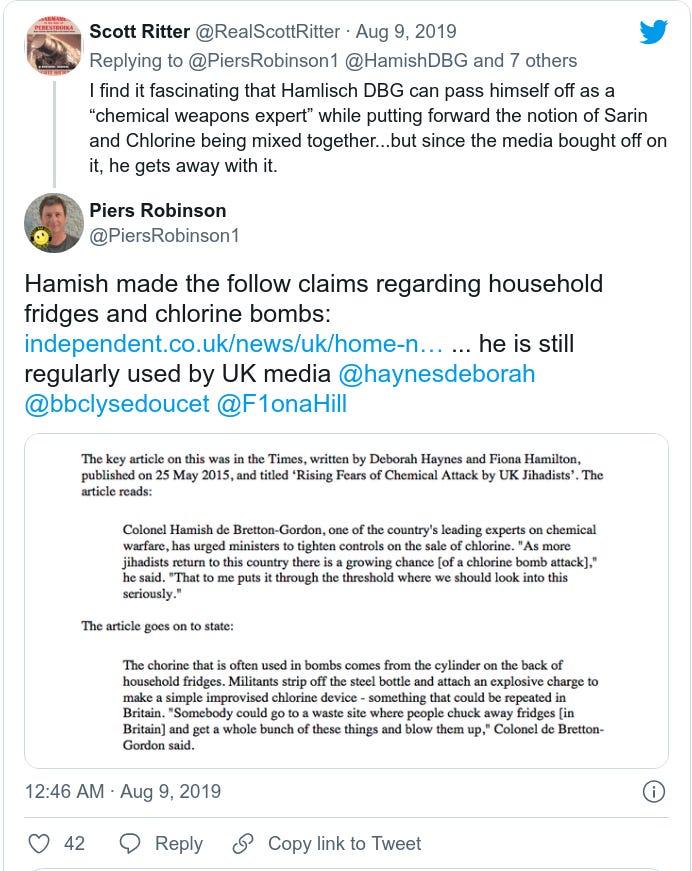 On more than one occasion, however, de Bretton-Gordon has directly involved Western journalists in MI6’s soil gathering efforts. For instance, during a 2014 podcast interview with Wilton Park, an NGO funded by the UK Foreign Office, de Bretton-Gordon boasted of his responsibility for a story in the Times of London alleging a Syrian chemical attack in the town of Sheikh al-Maqsood.