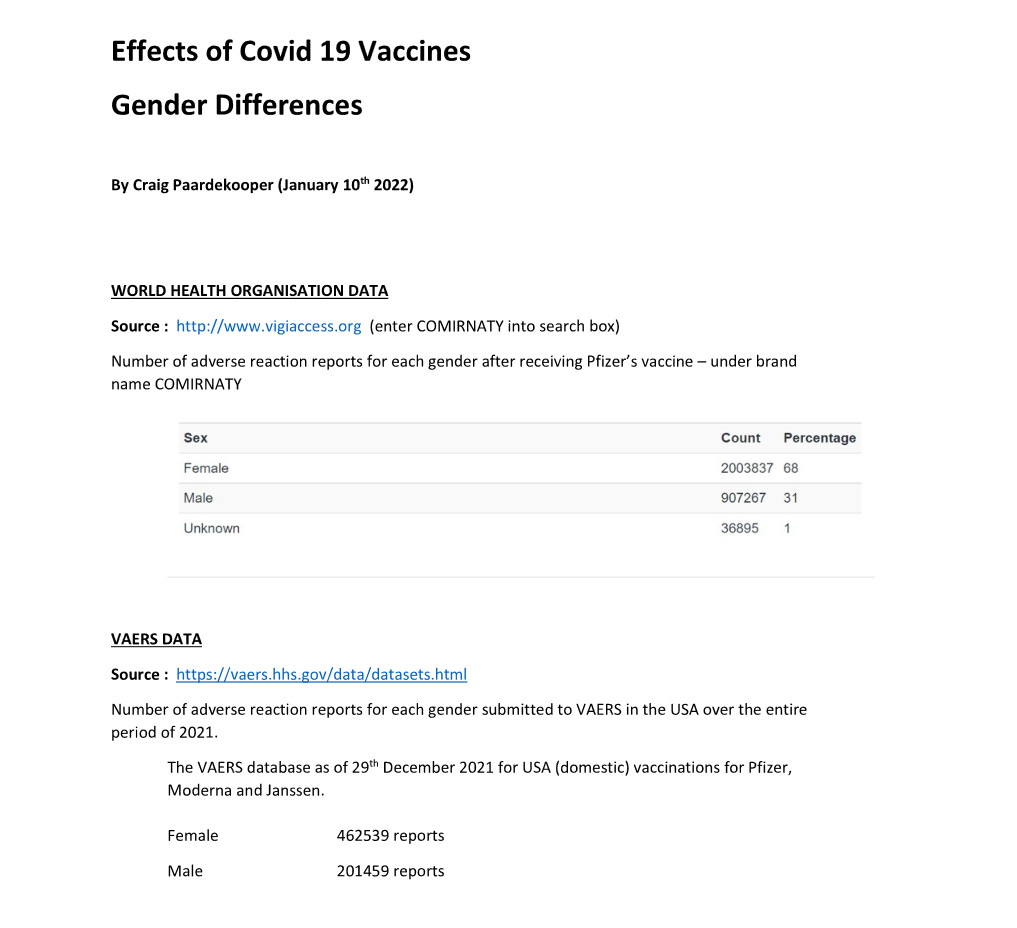 All reporting systems show the same ratio of harms for women/men & all shots (Pfizer, Moderna, AstraZeneca, Janssen) - Craig Paardekooper