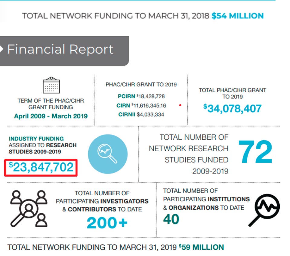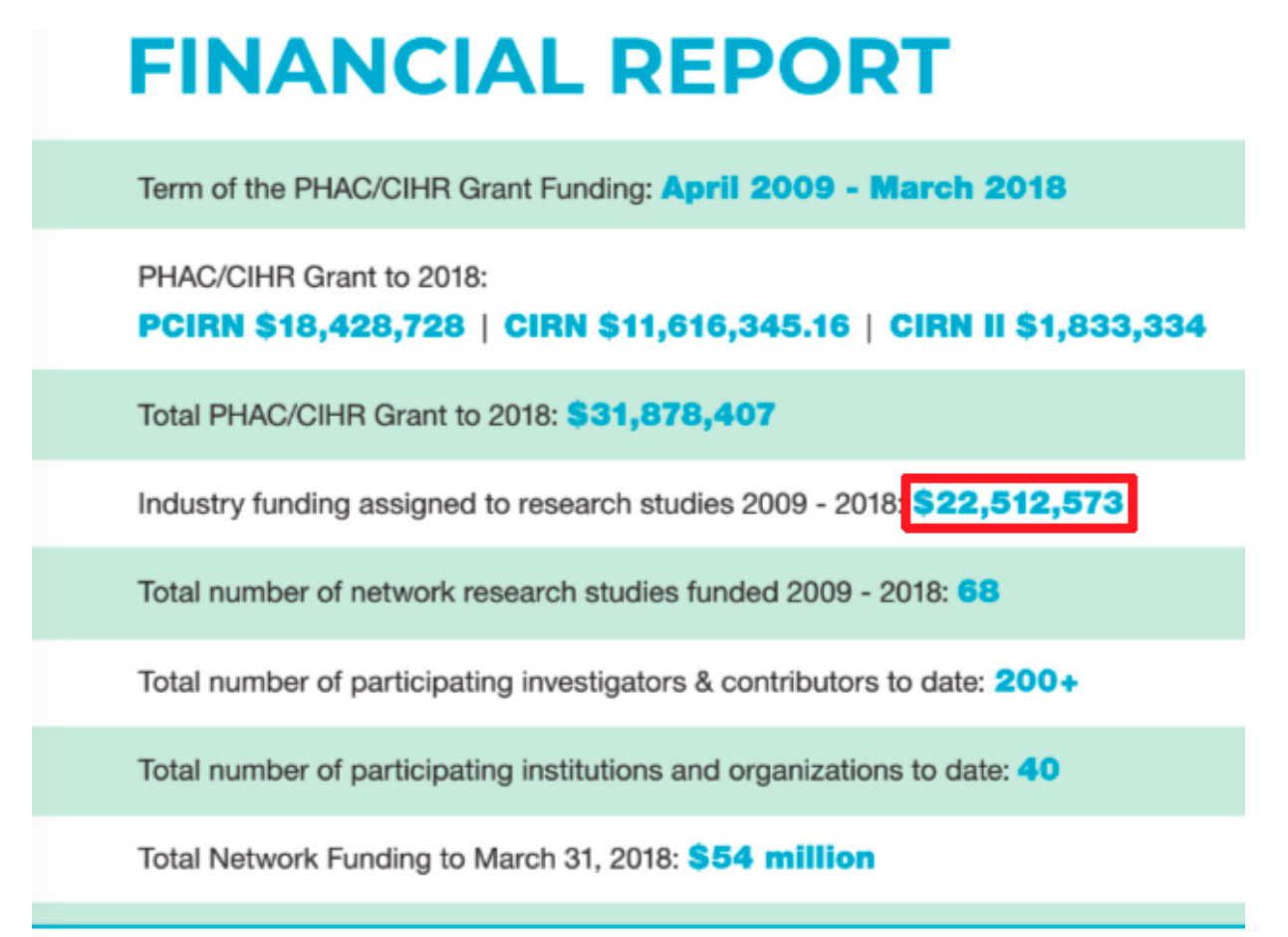 According to their financial statements, almost $24 million of the $59 million that the CIRN has received since 2009 has come from industry sources. Considering that Pfizer, GlaxoSmithKline, and Sanofi are listed as partners, the bulk of it probably was from them.