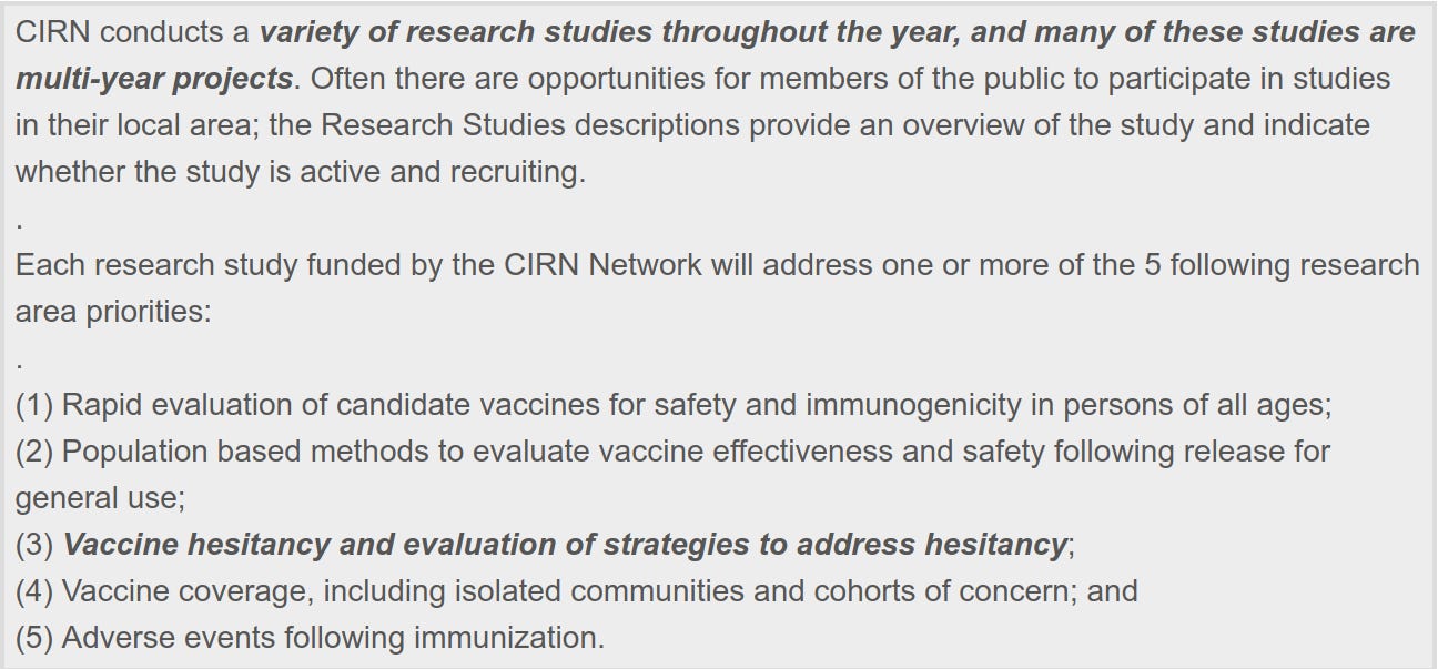 CIRN funds research into a variety of subtopics, including vaccine hesitancy. This refers to the normal reluctance to put strange medications into one’s body. They are also involved in trying to convince pregnant women to take it. Research has also been done into proper messaging for Public Health Officials, as in, what lines or scripts are most effective. Another was using the internet to explain why large portions of the public may be reluctant to take this.