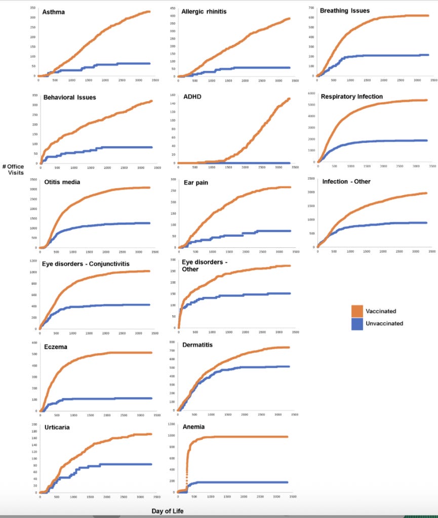 It could be dismissed as a one-off, but there are other vax vs unvaxxed studies. In 2020, Drs Paul Thomas and James Lyons Weiler published their paper Relative Incidence of Office Visits and Cumulative Rates of Billed Diagnoses Along the Axis of Vaccination. Thomas was a paediatrician in Portland, Oregon, who noticed unvaccinated children in his practice had better health than vaccinated. He reviewed their childhood records – results below.
