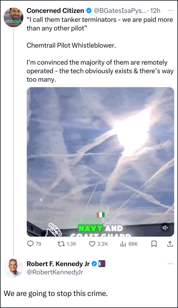 “We will end this crime,” said RFK Jr. in a comment under a post where an aviation whistle-blower spoke about how they are paid big money to spray chemtrails.