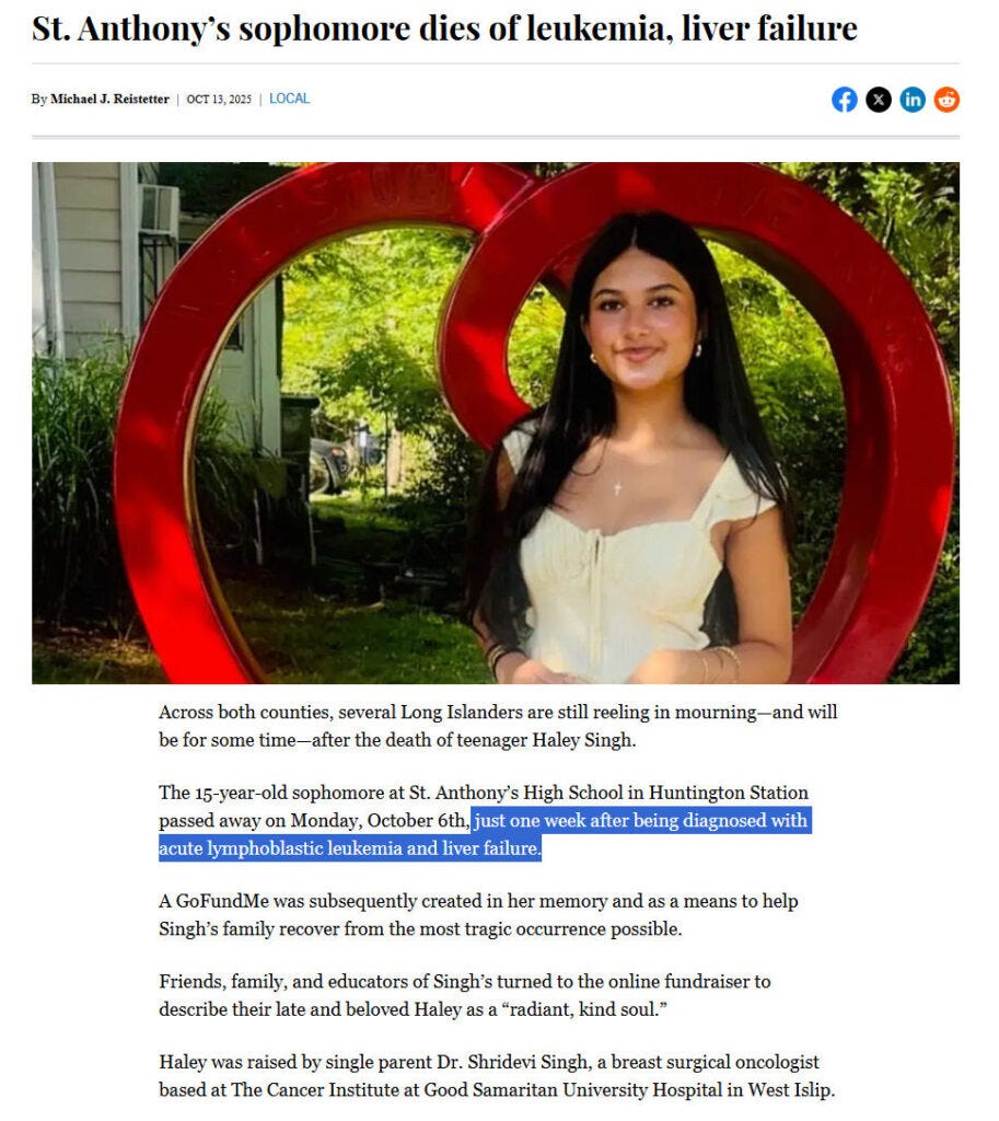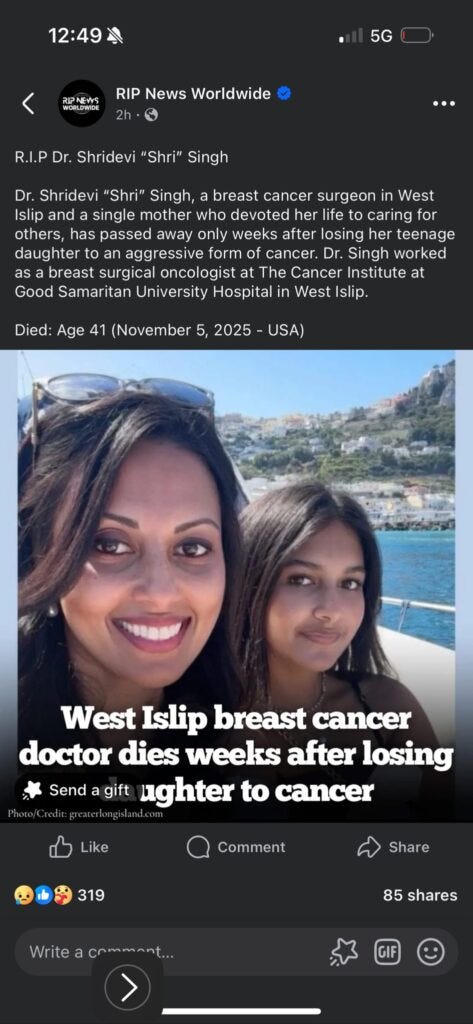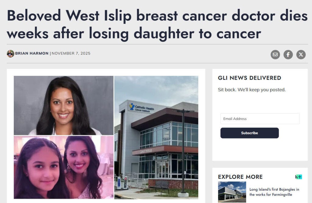 Dr. Singh, a 41 y/o breast cancer surgeon, died suddenly on November 5, 2025—just weeks after her 15 y/o daughter Haley passed away from an incredibly aggressive case of Acute Lymphoblastic Leukemia