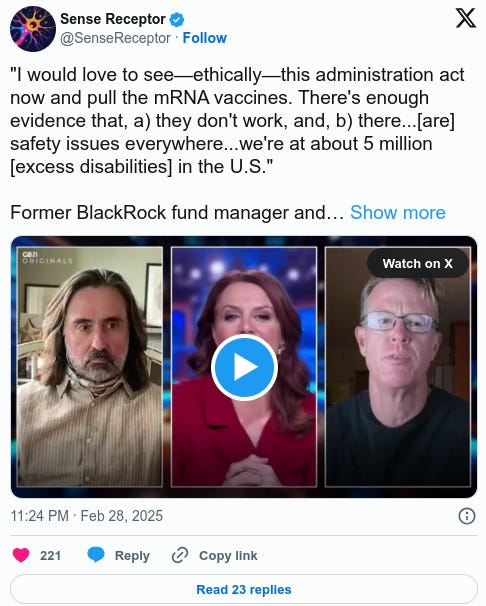 "I would love to see—ethically—this administration act now and pull the mRNA vaccines. There's enough evidence that, a) they don't work, and, b) there...[are] safety issues everywhere...we're at about 5 million [excess disabilities] in the U.S."