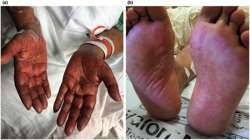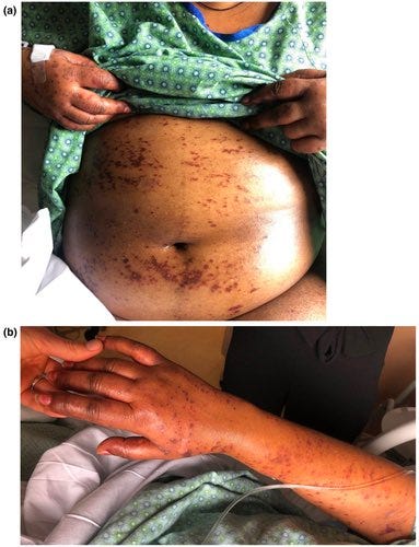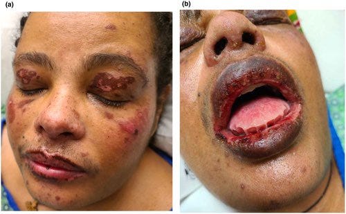 A 46 Year Old woman with Stevens–Johnson syndrome precipitated by the Moderna COVID vaccine 3 days after vaccination.