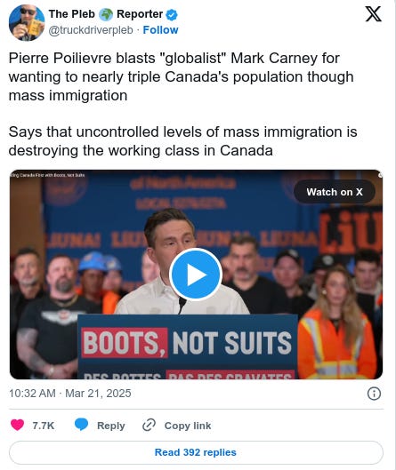 Pierre Poilievre blasts "globalist" Mark Carney for wanting to nearly triple Canada's population though mass immigration