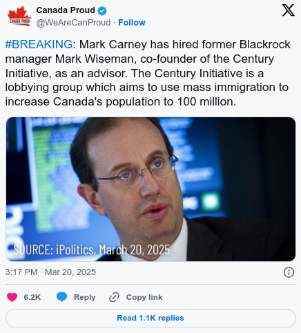 BREAKING: Mark Carney has hired former Blackrock manager Mark Wiseman, co-founder of the Century Initiative, as an advisor. The Century Initiative is a lobbying group which aims to use mass immigration to increase Canada's population to 100 million
