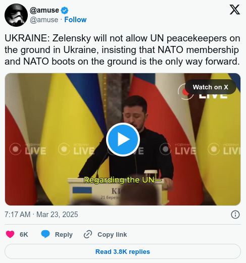 Zelensky will not allow UN peacekeepers on the ground in Ukraine, insisting that NATO membership and NATO boots on the ground is the only way forward