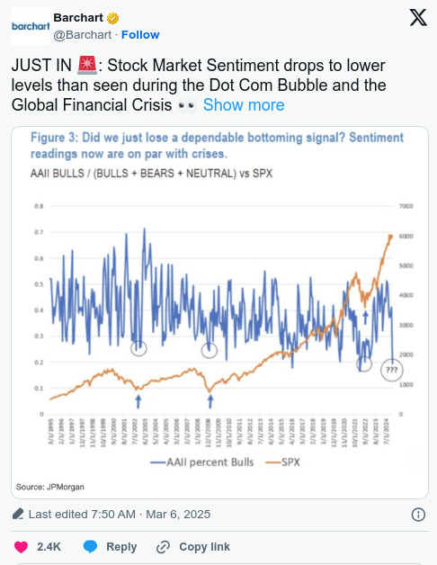 Stock Market Sentiment drops to lower levels than seen during the Dot Com Bubble and the Global Financial Crisis