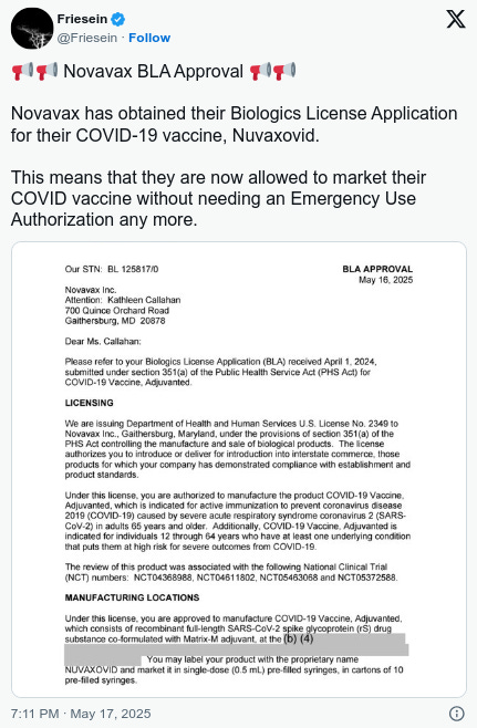 Novavax has obtained their Biologics License Application for their COVID-19 vaccine, Nuvaxovid