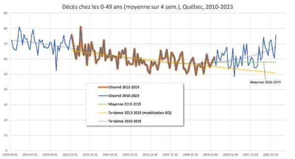 Deaths in the 0-49 years-old category in Quebec (four weeks average) for the period 2010-2023. The orange line is “observed” (excess mortality) for 2013-2019. The blue line is “observed” for 2010-2023. The green line is “average” for 2016-2019. The yellow line is “trend” for 2013-2019 (modelling by the institute). The dotted line is “trend for 2010-2023. (Institut de la statistique du Québec)