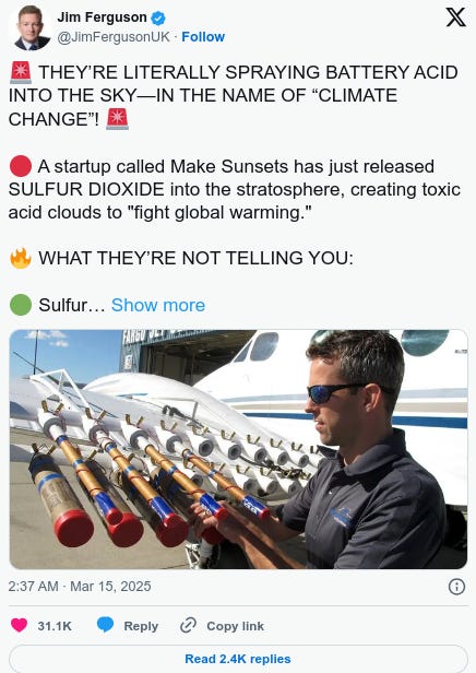 Also: THEY’RE LITERALLY SPRAYING BATTERY ACID INTO THE SKY—IN THE NAME OF “CLIMATE CHANGE”!