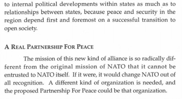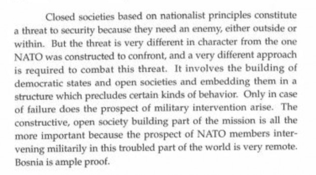 The essay lays out a new mission for NATO after the Cold War. NATO would no longer be a defensive alliance against Russia – that is obsolete. Instead, it would proactively go out and shape other countries into “open societies.”