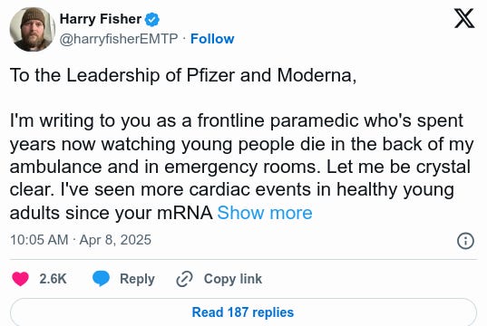 Let me be crystal clear. I've seen more cardiac events in healthy young adults since your mRNA products rolled out than in my entire career before and I’ve been an EMT since 1997.