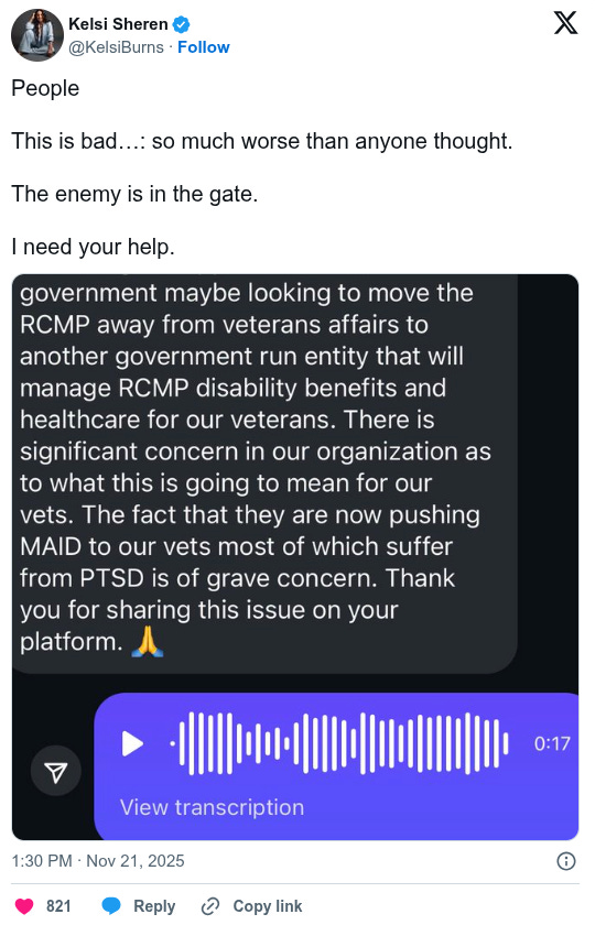 Sheren also shared on X a message from another RCMP veteran who retired due to cancer and expressed concern that such seminars may be targeting vulnerable veterans as a way to reduce government spending. Sheren wrote that she has interviewed several veterans who said they were illegally offered MAiD, and noted previous incidents where Veterans Affairs Canada employees were caught offering assisted suicide to veterans “who never asked for it, including one trying to get a wheelchair ramp.”