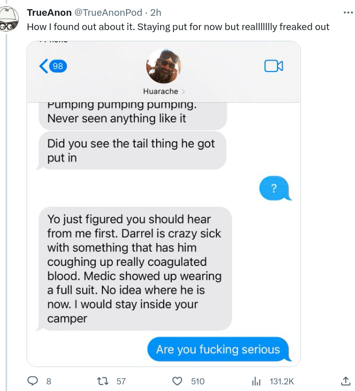 "The rumors on the ground here are that there's some sort of virus on the loose at Burning Man that causes boils/vomiting/hemorrhaging."
