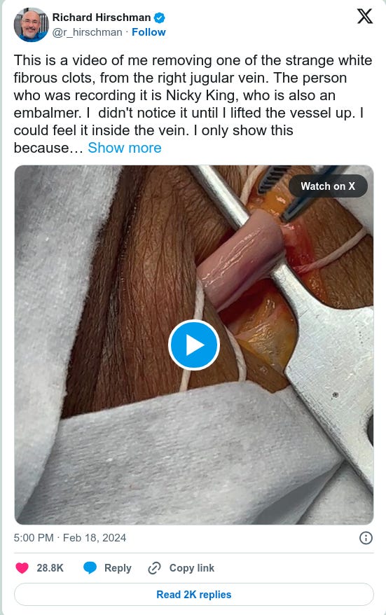 Richard Hirschman: This is a video of me removing one of the strange white fibrous clots, from the right jugular vein.