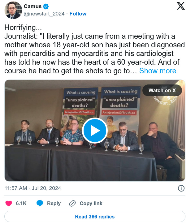 Just last week I was at my local golf club and I was chatting with one of the staff that work there. She was telling me that she routinely now has to go for cardiac exams because no fewer than 4 girls that she knows, that she plays hockey with at the university level have all been diagnosed with myocarditis following the shots and I'm told they can no longer play collegiate level sports.