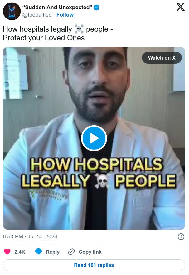 Exposing The Darkness is a reader-supported publication. To support my work, please consider becoming a paid subscriber. One-time or recurring donations can be made through Ko-Fi: Here's a reminder that hospitals have been turned into "killing fields" since the beginning of COVID, deploying deadly protocols that have murdered 500K+ Americans