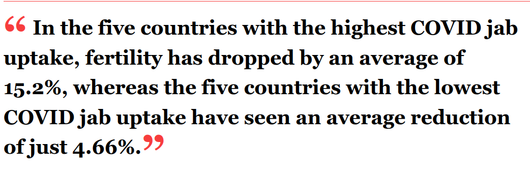 After looking into it further, Campbell discovered that in the five countries with the highest COVID jab uptake, fertility has dropped by an average of 15.2%, whereas the five countries with the lowest COVID jab uptake have seen an average reduction of just 4.66%.