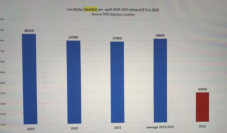 Other countries are also seeing unexpected birth rate reductions, nine months after the start of the mass vaccination campaign against COVID. Between January and April 2022, Switzerland's birth rate was 15% lower than expected, the U.K.'s was down by 10% and Taiwan's was down 23%. (25,26,27)