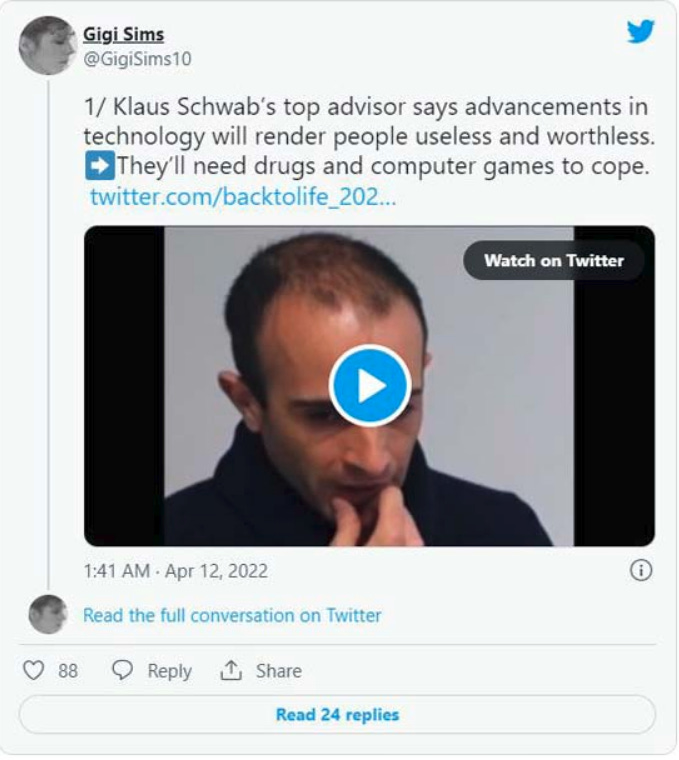 In another interview, Harari discussed what Schwab refers to as The Fourth Industrial Revolution (read: transhumanism), noting that we’re now learning to “produce bodies and minds” (meaning augmented bodies, and cloud and artificial intelligence-connected minds) and that one of the greatest challenges we face will be what to do with all the people that have become obsolete in the process.
